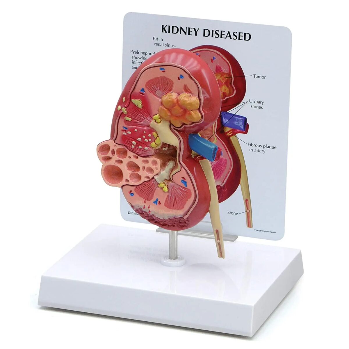 Este modelo anatómico de riñón de gran tamaño presenta dos caras detalladas: un lado muestra la anatomía normal del riñón y el otro lado muestra diversas condiciones patológicas, incluyendo infección, cicatrices, atrofia, cálculos urinarios, tumor, enfermedad poliquística y efectos de la hipertensión. Es una herramienta educativa ideal para médicos y profesionales de la salud.
