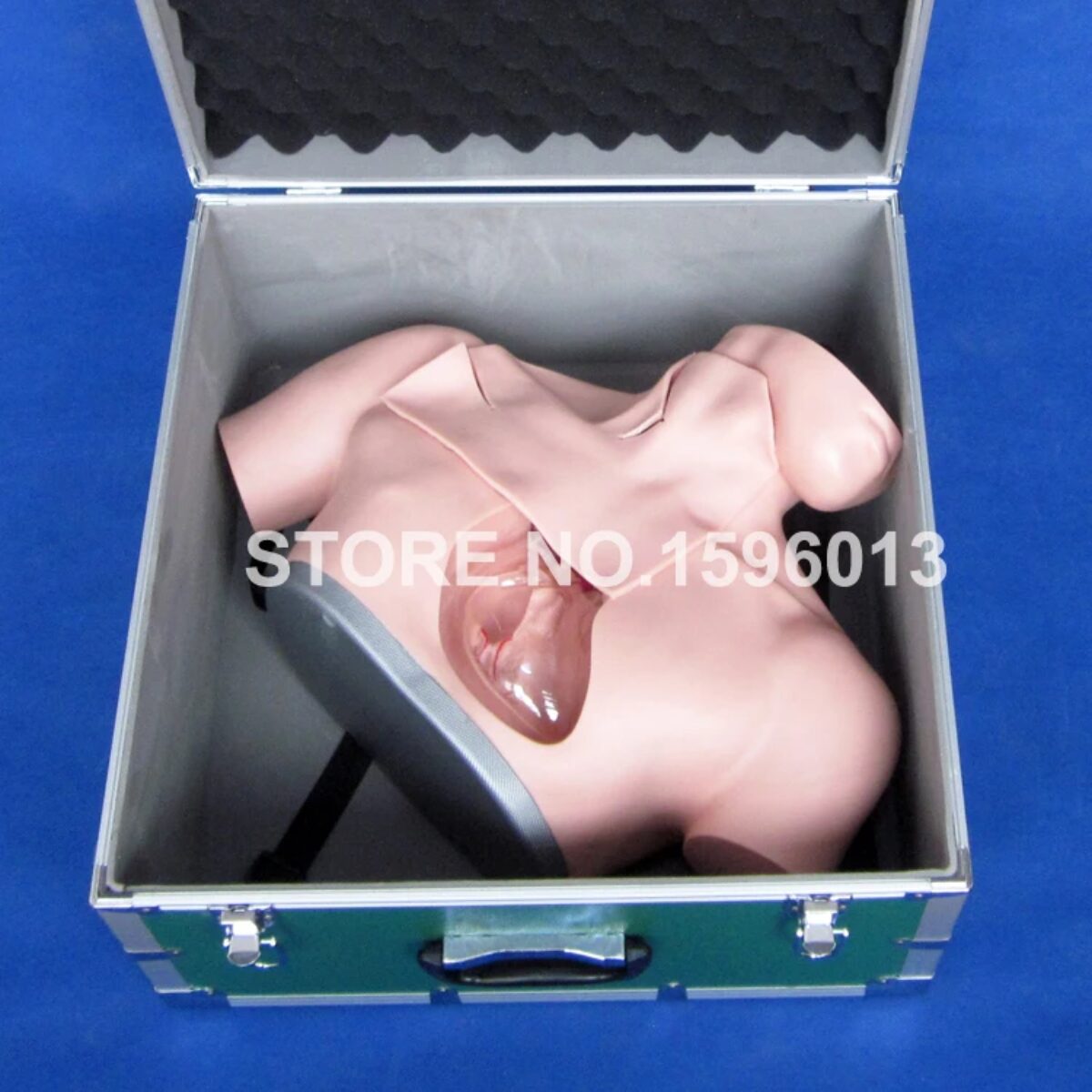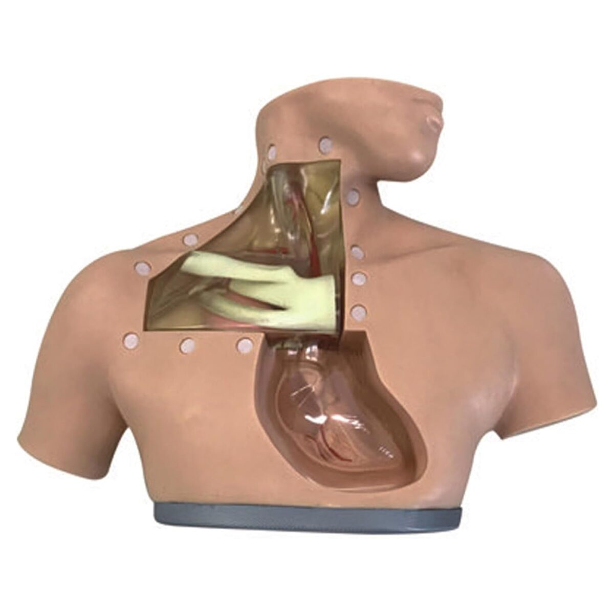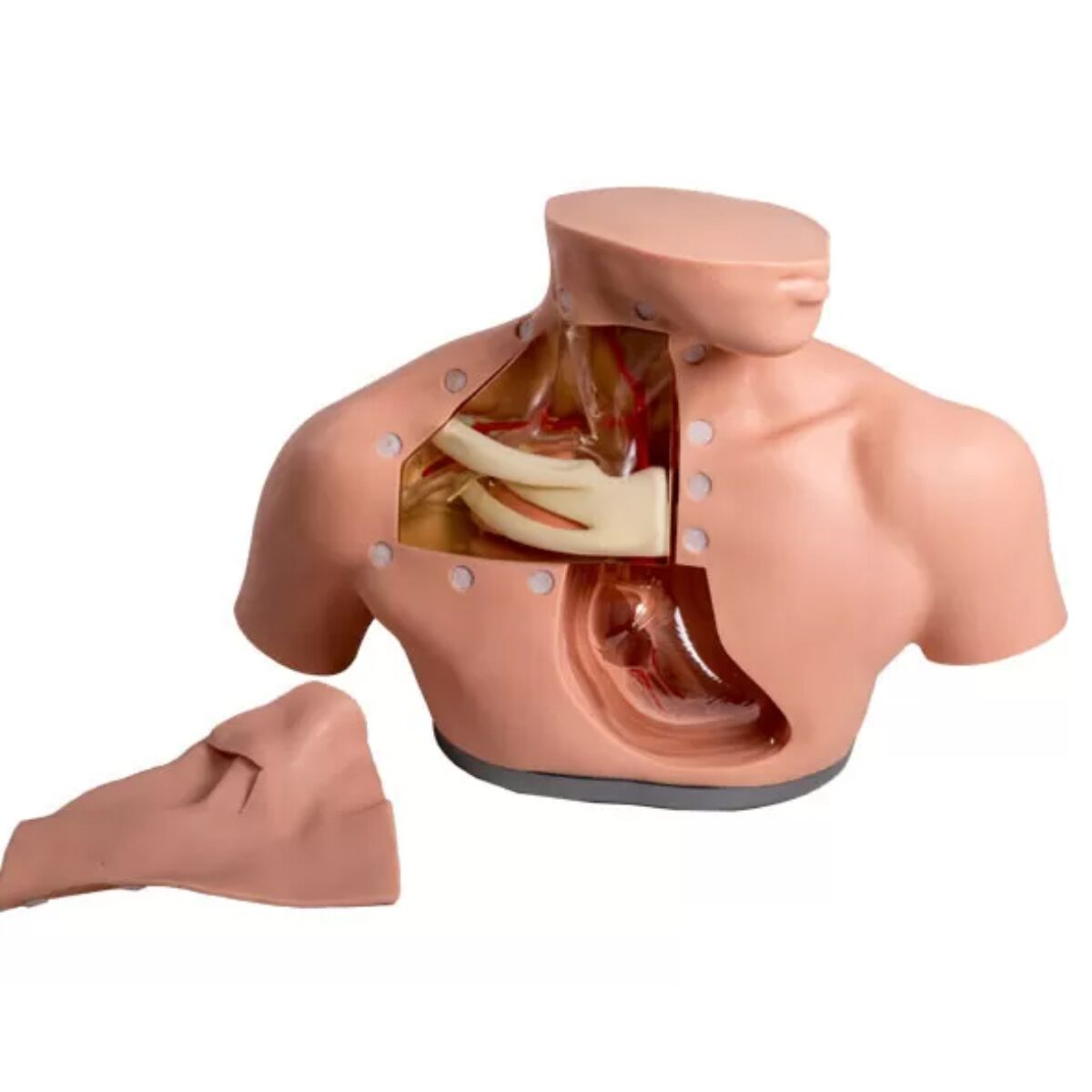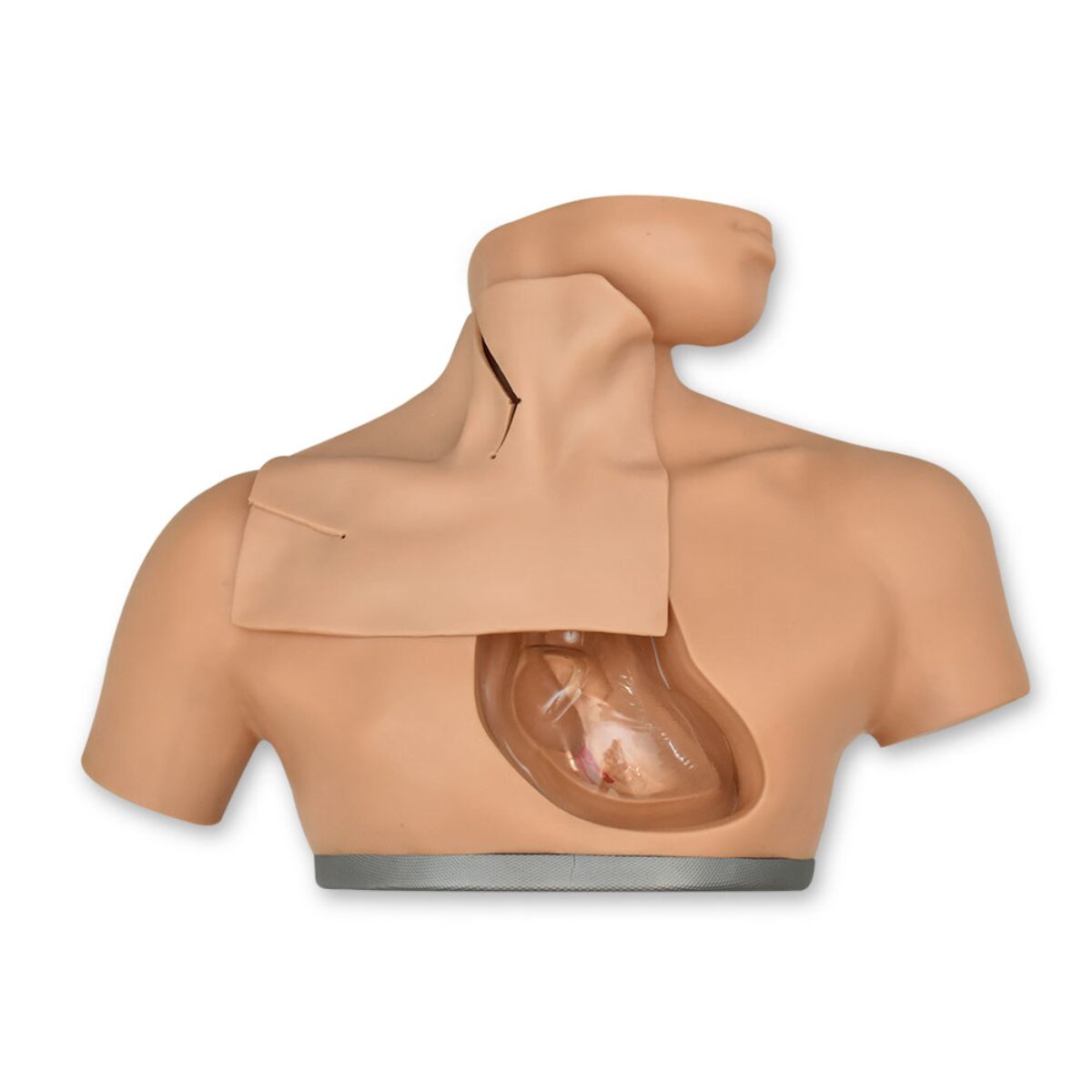 - Cobertura Cutánea en el Tórax Derecho: Simula de manera realista el sitio de punción, mejorando la práctica de la operación de punción y fijación.