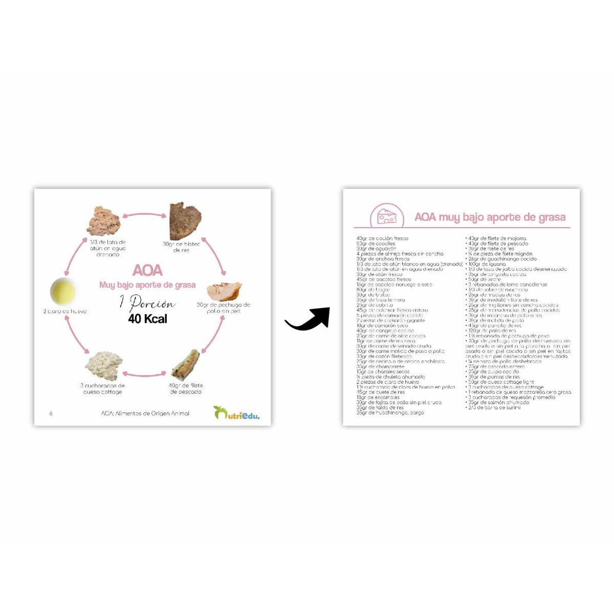 - En la parte posterior de cada tarjeta, encontrarás un listado detallado de los alimentos equivalentes de cada grupo y categoría, siguiendo las pautas del Sistema Mexicano de Alimentos Equivalentes (SMAE) en su 5a edición.